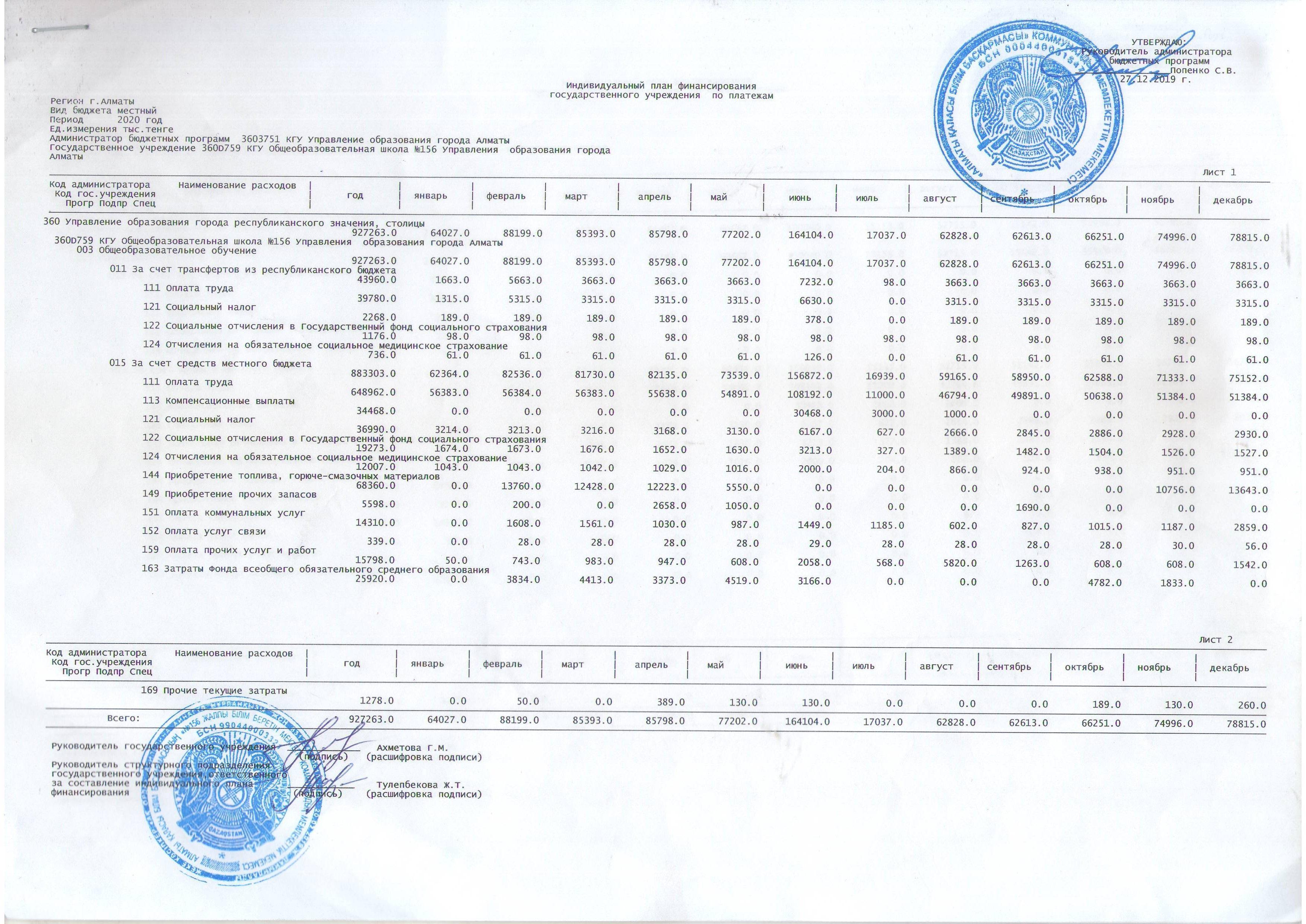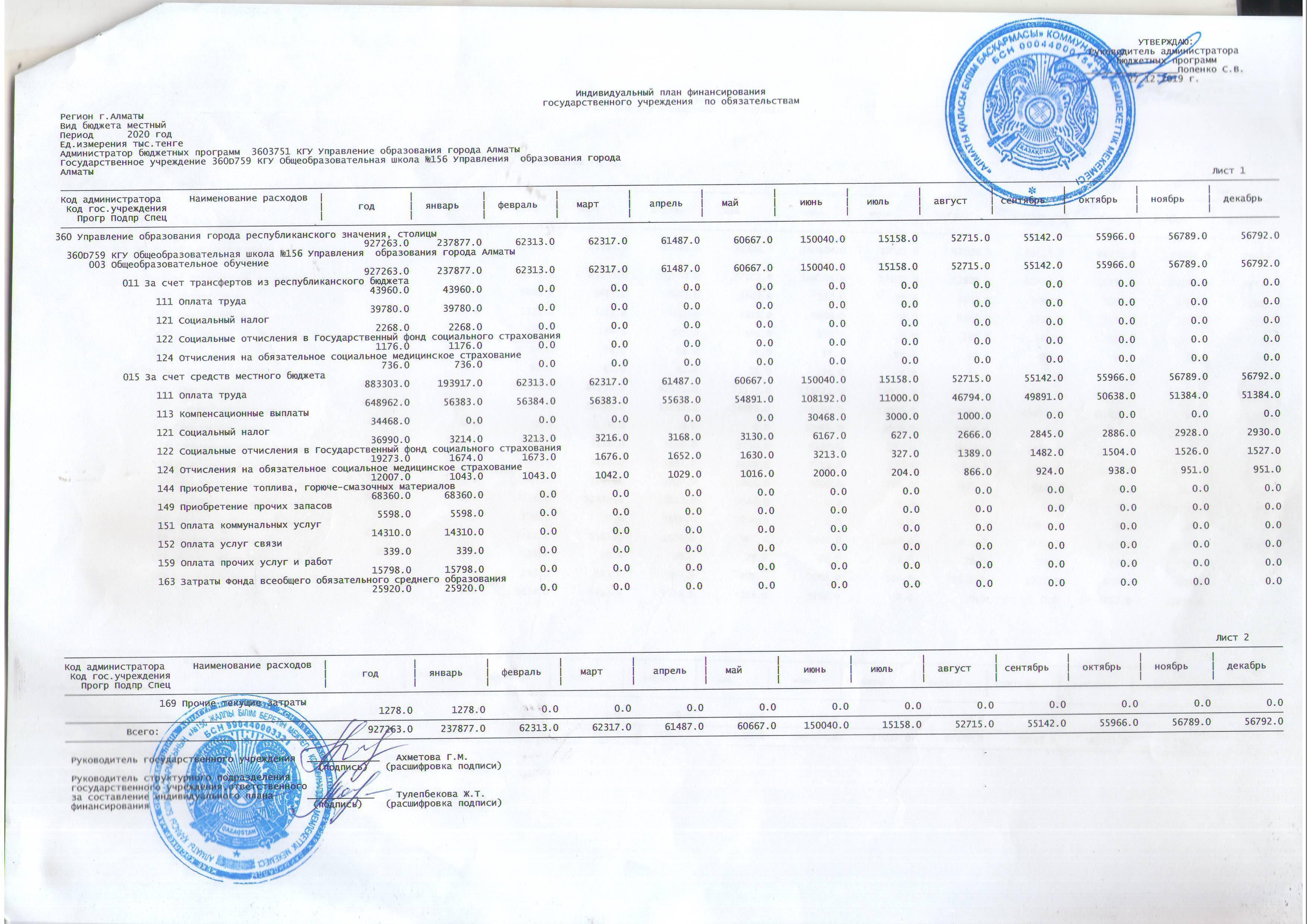 » План финансирования 2020