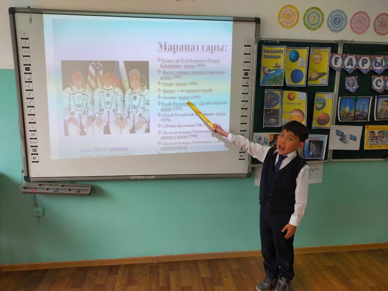 Сынып: 2 «Ж» Сынып жетекшісі: Бекбау Н.Қ Пәні: Сынып сағаты Тақырыбы: 12 сәуір-Ғарышкерлер күні Максаты: Балаларға Ғарыш және ғарышкерлер туралы толық түсінік беру, білімдерін одан әрі кеңейту. Сыйластыққа тәрбиелеу.