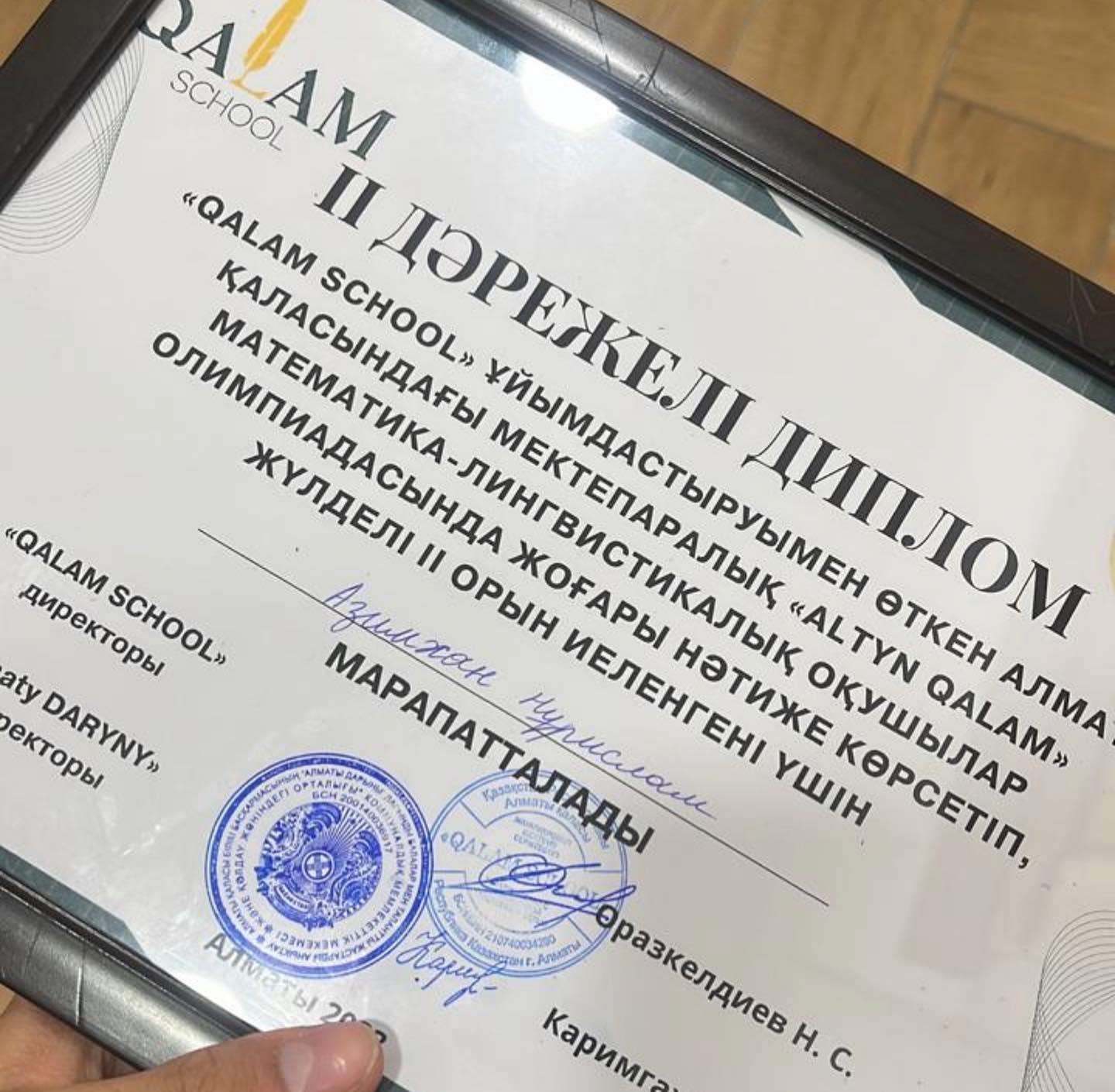«QALAM SCHOOL» ұйымдастыруымен өткен Алматы қаласындағы мектепаралық «ALTYN QALAM» МАТЕМАТИКА-ЛИНГВИСТИКАЛЫҚ оқушылар олимпиадасында жоғары нәтиже көрсетіп, жүлделі II ОРЫН иеленгені үшін, АЗИМХАН НҰРИСЛАМ марапатталады. 📗ҚҰТТЫҚТАЙМЫЗ! 🌸Пән мұғал