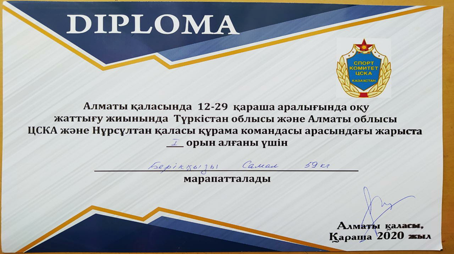 28 сентябрь 2021 0 1 2 3 4 5 Алматы облысы ЦСКА және Нұрсұлтан қаласы құрама командасы арасындағы жарыста I орын алғаны үшін Берікқызы Самал марапатталды. Осы беттің QR-коды:QR-код этой страницы: