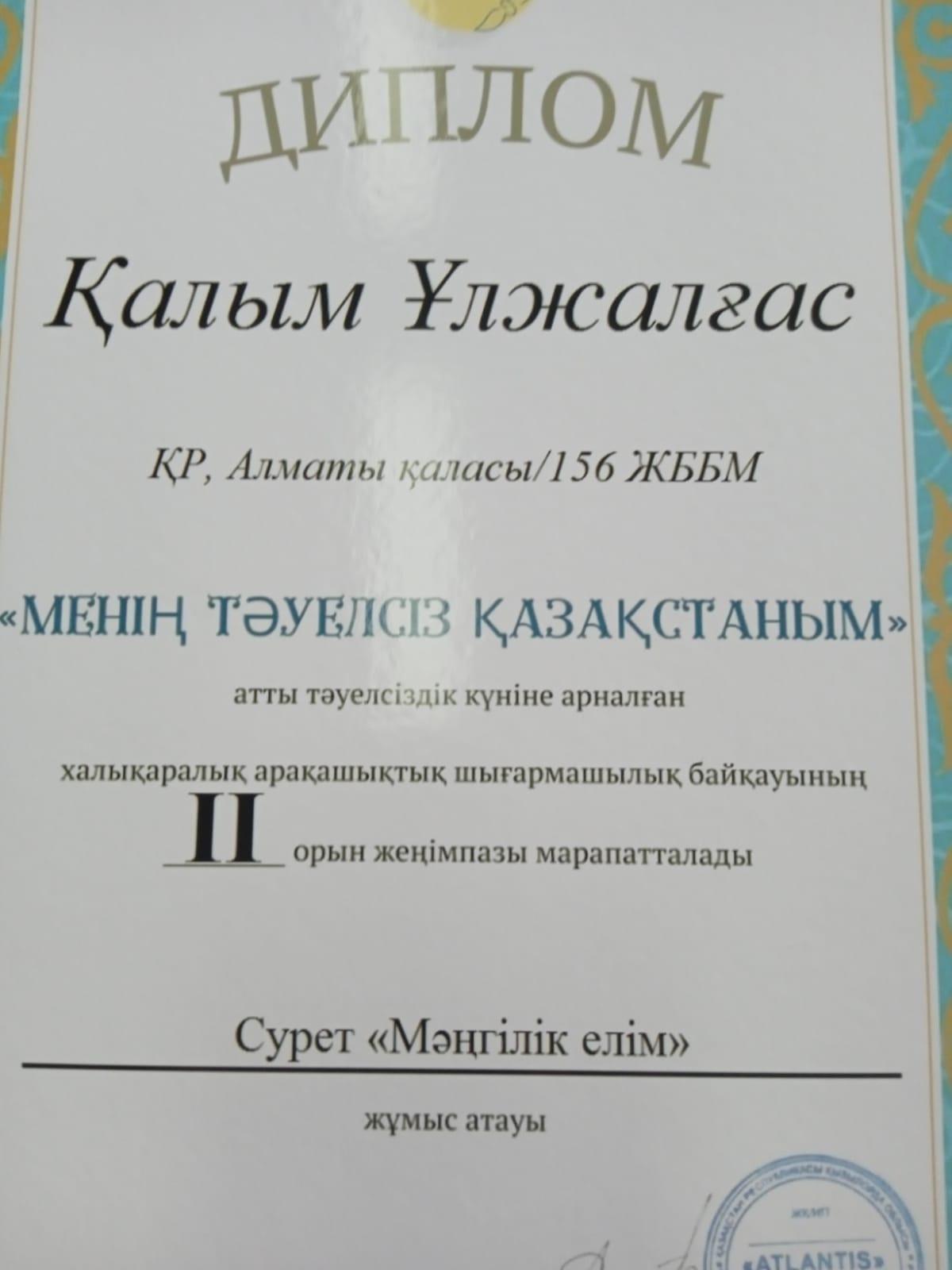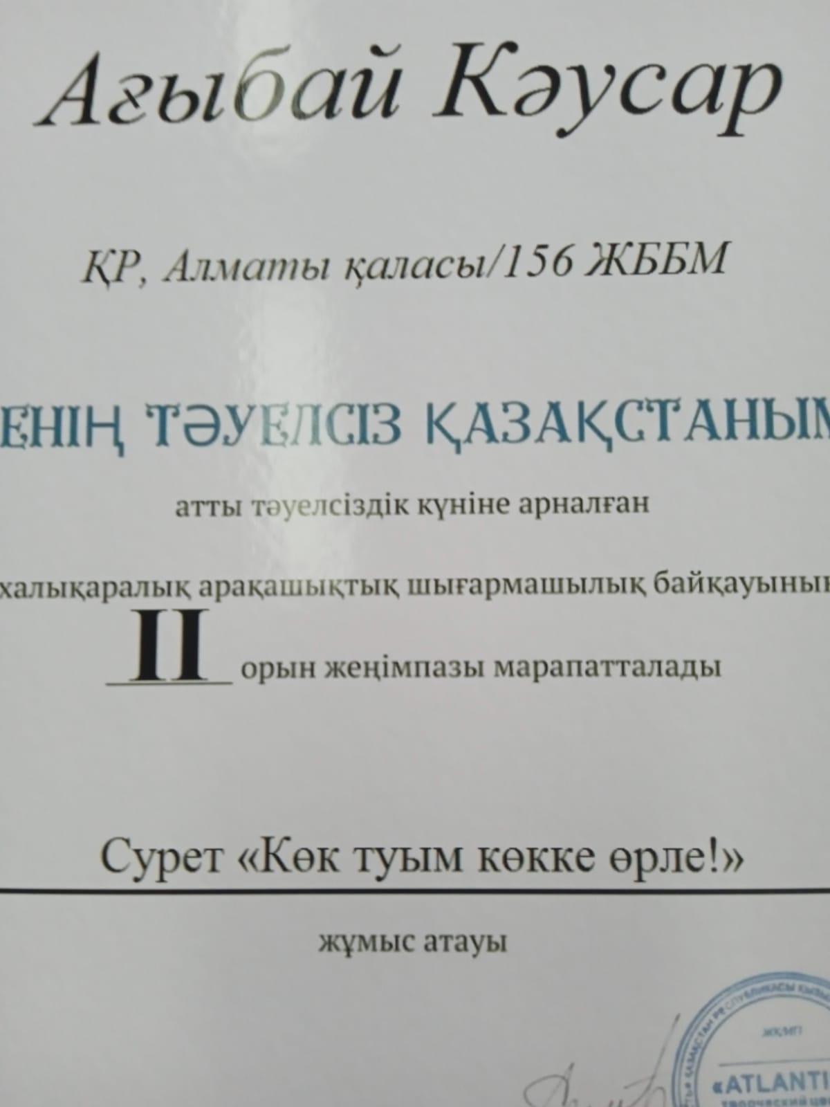 21 декабрь 2021 0 1 2 3 4 5 "Менің Тәуелсіз Қазақстан" атты халықаралық арақашықтық шығармашылық байқауына қатысып марапатталды. Құттықтаймыз!!!!!! Осы беттің QR-коды:QR-код этой страницы:
