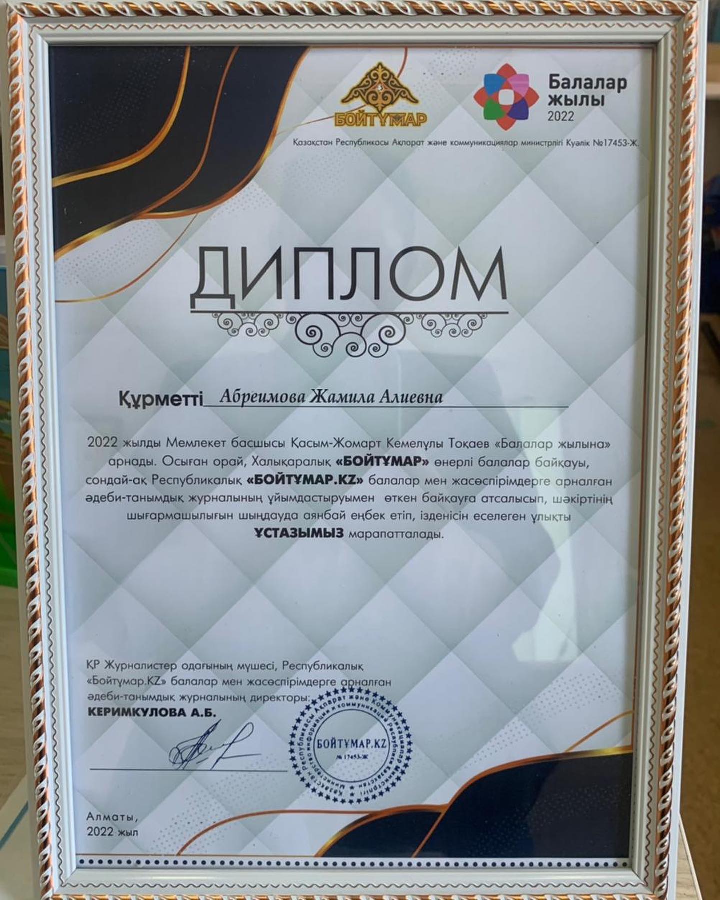 Мектебіміздің 1 "В" сынып оқушысы Ғалымбекқызы Айару 25 қазан Республика күніне арналған Халықаралық "Бойтұмар" өнерлі балалар байқауынан "Бас жүлдені" иеленді. Сынып жетекшісі: Абдреимова Жамила Алиевна