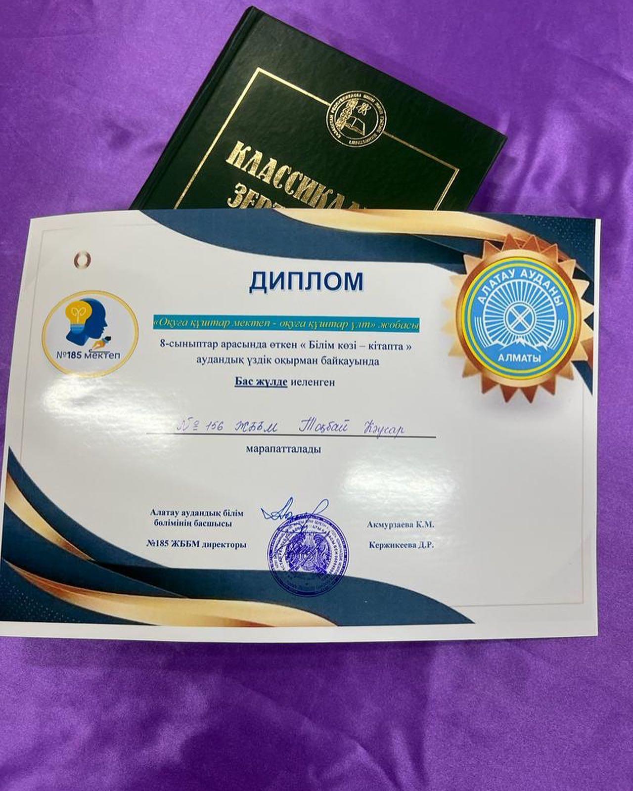 №156 жалпы білім беретін мектеп » Біз туралы » Жетістіктеріміз » “Оқуға құштар мектеп- оқуға құштар ұлт” жобасы аясында 8-сыныптар арасында “Білім көзі кітапта” тақырыбында Алатау ауданындағы мектептер арасында үздік оқырман байқауына қатысып БАС ЖҮЛДЕГЕ ие болған ТОҚБАЙ КӘУСАРДЫ шын жүректен құттықтаймыз!⭐️✨