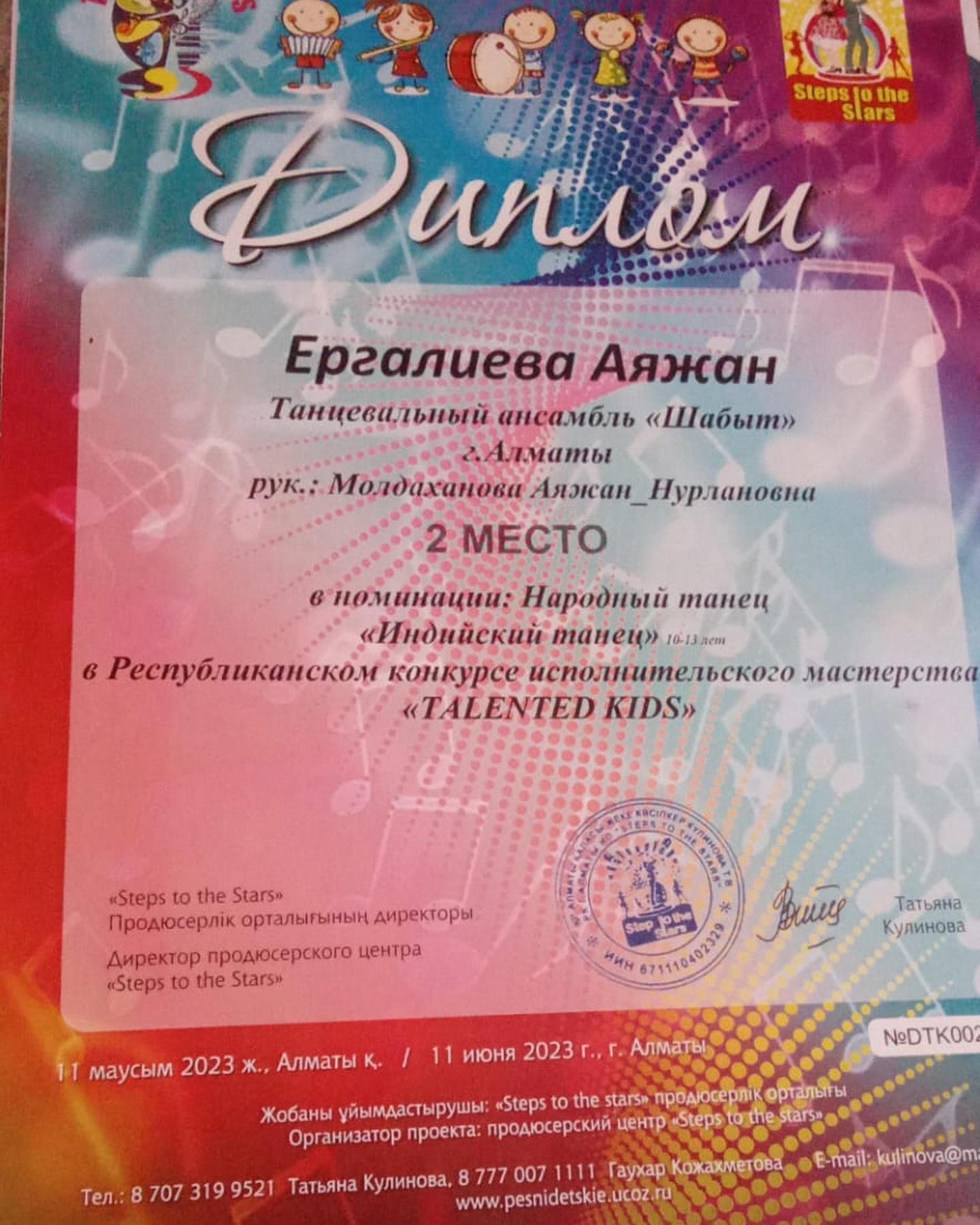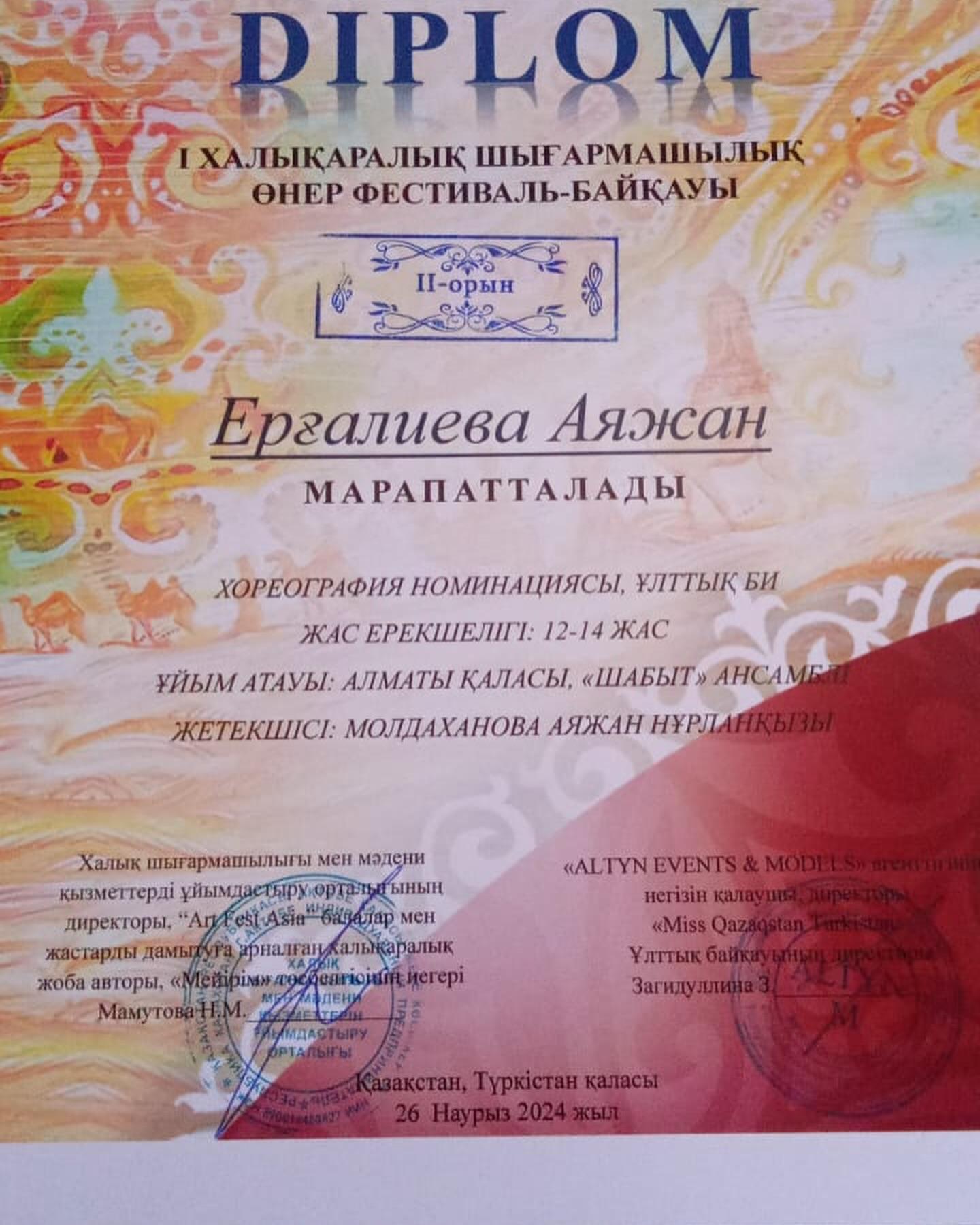 🇰🇿8 “ А” сынып оқушысы Ергалиева Аяжан 1. І Халықаралық шығармашылық өнер фестиваль- байқауы. Хореография номинациясы,ұлттық би - 2 орын. 2. Республика “ Bala jarys “ байқауында “ Хореография “ номинациясы бойынша үздік өнер көрсеткені үшін марап