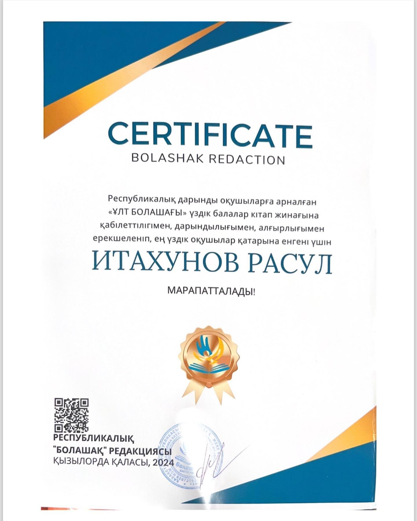 Ученик 2 «И» класса ✨Итахунов Расул✨был награжден сертификатом за публикацию материалов в Республиканской книге “Ұлт болашағы” посвещённой одаренным ,талантливым и творческим детям.