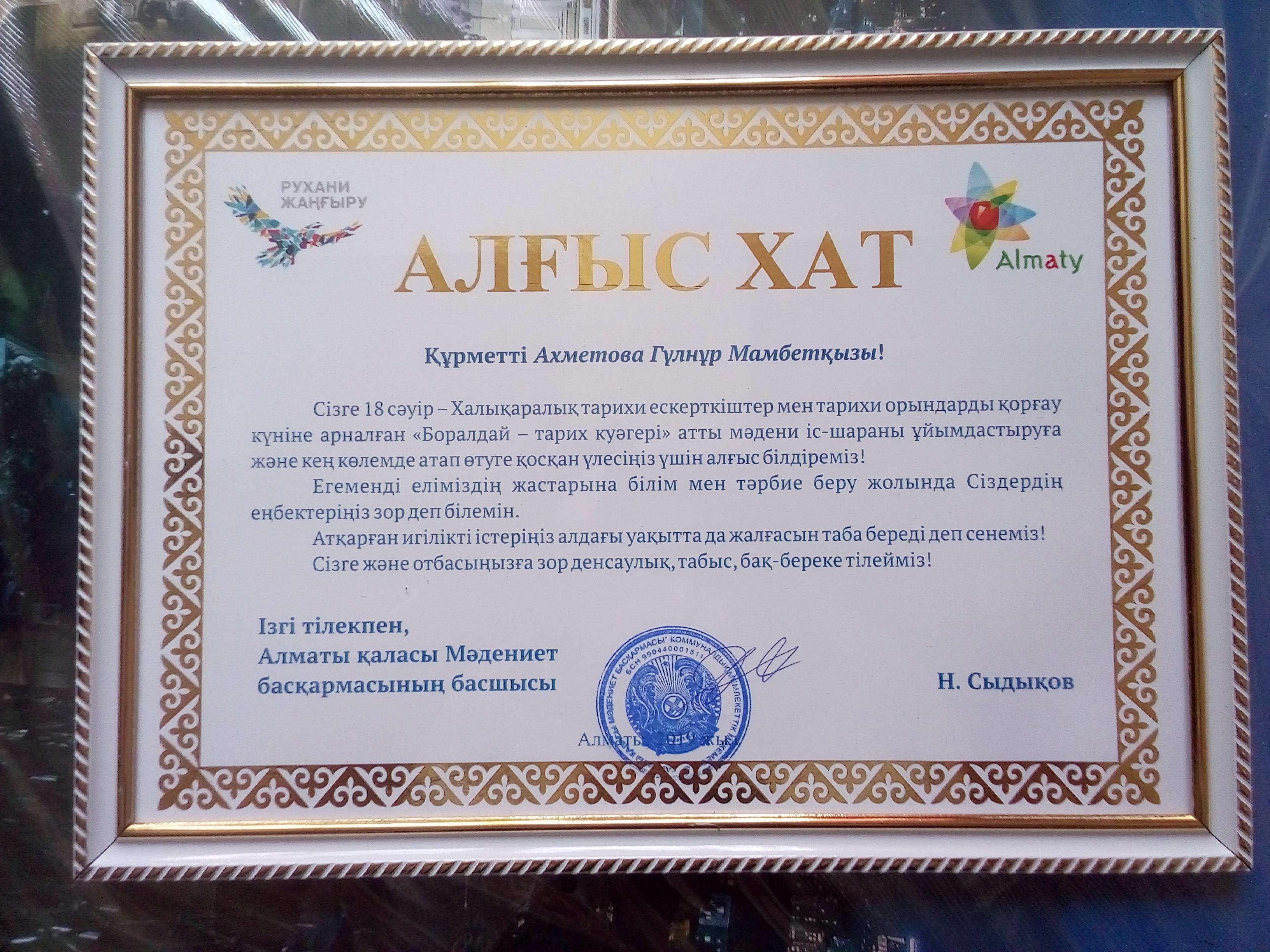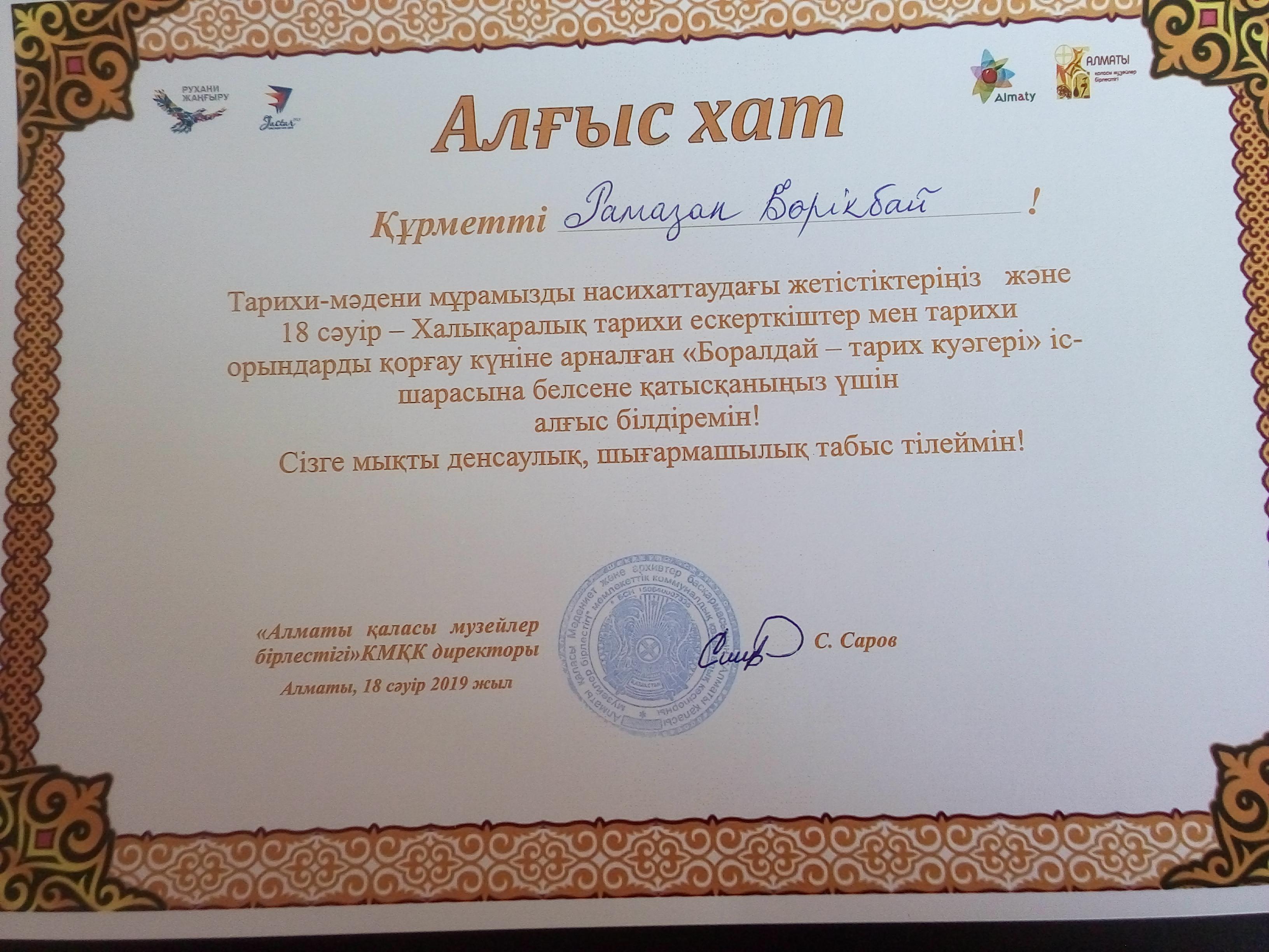 18- сәуір- Халықаралық тарихи ескерткіштер мен тарихи орындарды қорғау күніне арналған "Боралдай- тарих куәгері" атты мәдени іс- шара Сақ қорғанында өтті. № 156 жалпы білім беретін мектептің "Айнұр би" тобы мен "Әуен" тобы қатысты. Мектеп директоры мен жас өнерпаздарымыз бен жетекшілер алғыс хатпен марапатталды. Шын жүректен құттықтаймыз!!!